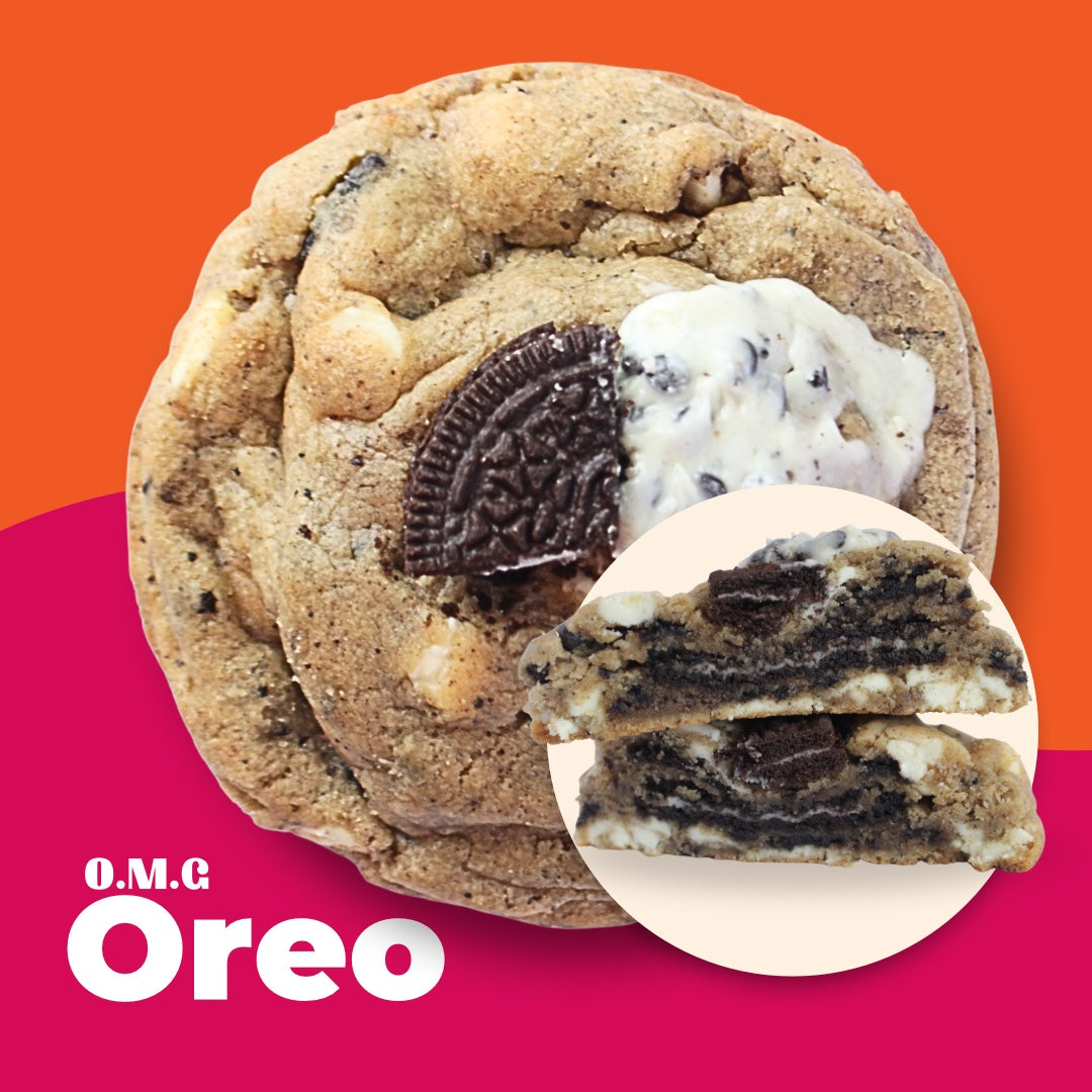 A rich, 5 oz brown butter cookie mixed with premium white chocolate chips and crunchy crushed Oreos, all stuffed with a whole Oreo at its center. Every bite combines creamy, crunchy, and melt-in-your-mouth flavors that’ll have you saying “OMG!” Grab yours and taste the magic.